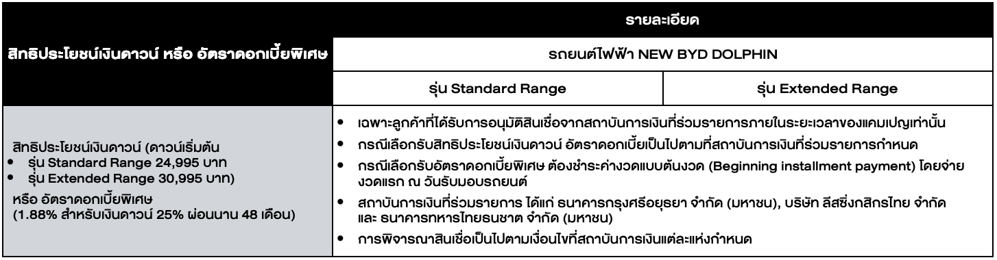 ข้อกำหนดและเงื่อนไขแคมเปญ โปรจัดหนัก! เป็นเจ้าของง่ายกว่า สำหรับรถยนต์ไฟฟ้า นิว บีวายดี ดอลฟิน (NEW BYD DOLPHIN) รุ่น สแตนดาร์ด เรนจ์ (Standard Range) หรือ รุ่น เอ็กซ์เทนเดด เรนจ์ (Extended Range)