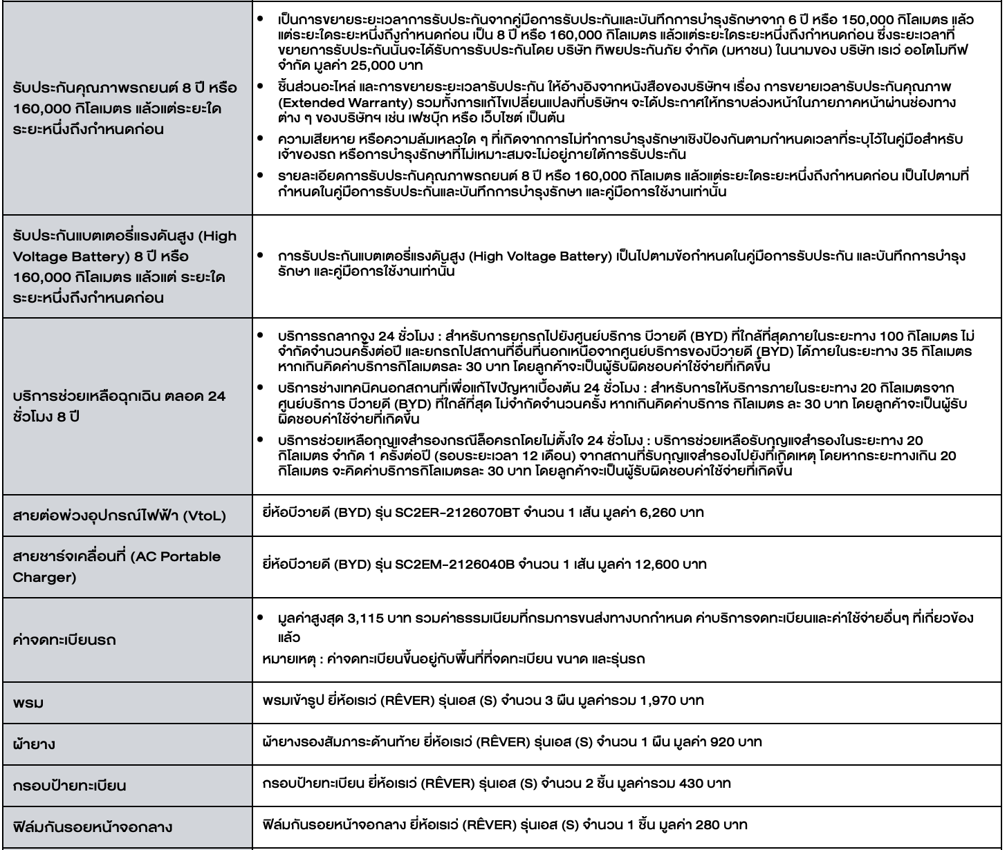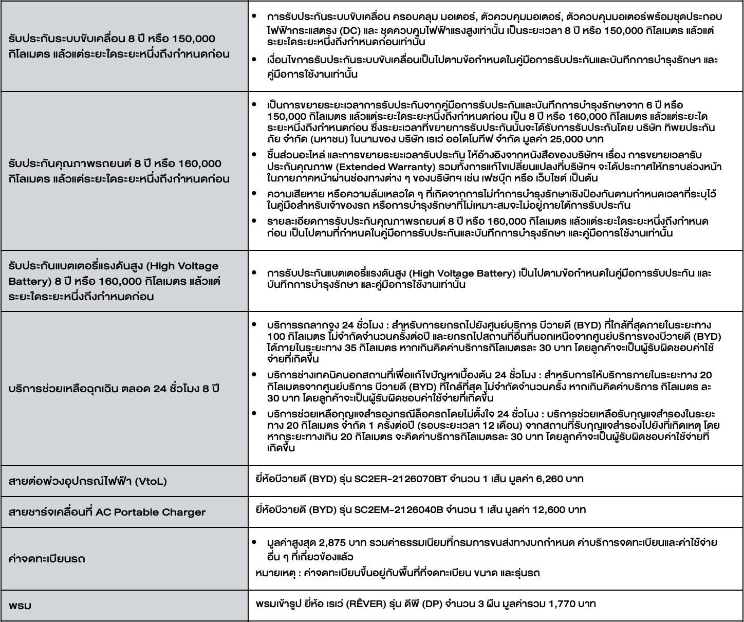 - บริษัทฯ อาจเปลี่ยนแปลง แก้ไข เพิ่มเติมเงื่อนไขต่างๆ ของแคมเปญตามที่บริษัทฯ จะได้มีการประกาศให้ทราบล่วงหน้าเป็นครั้งคราว (ถ้ามี) ผ่านช่องทางต่างๆ ของบริษัทฯ เช่น Facebook (BYD RÊVER Thailand) หรือ Website ของบริษัทฯ ( https://www.reverautomotive.com ) เป็นต้น
