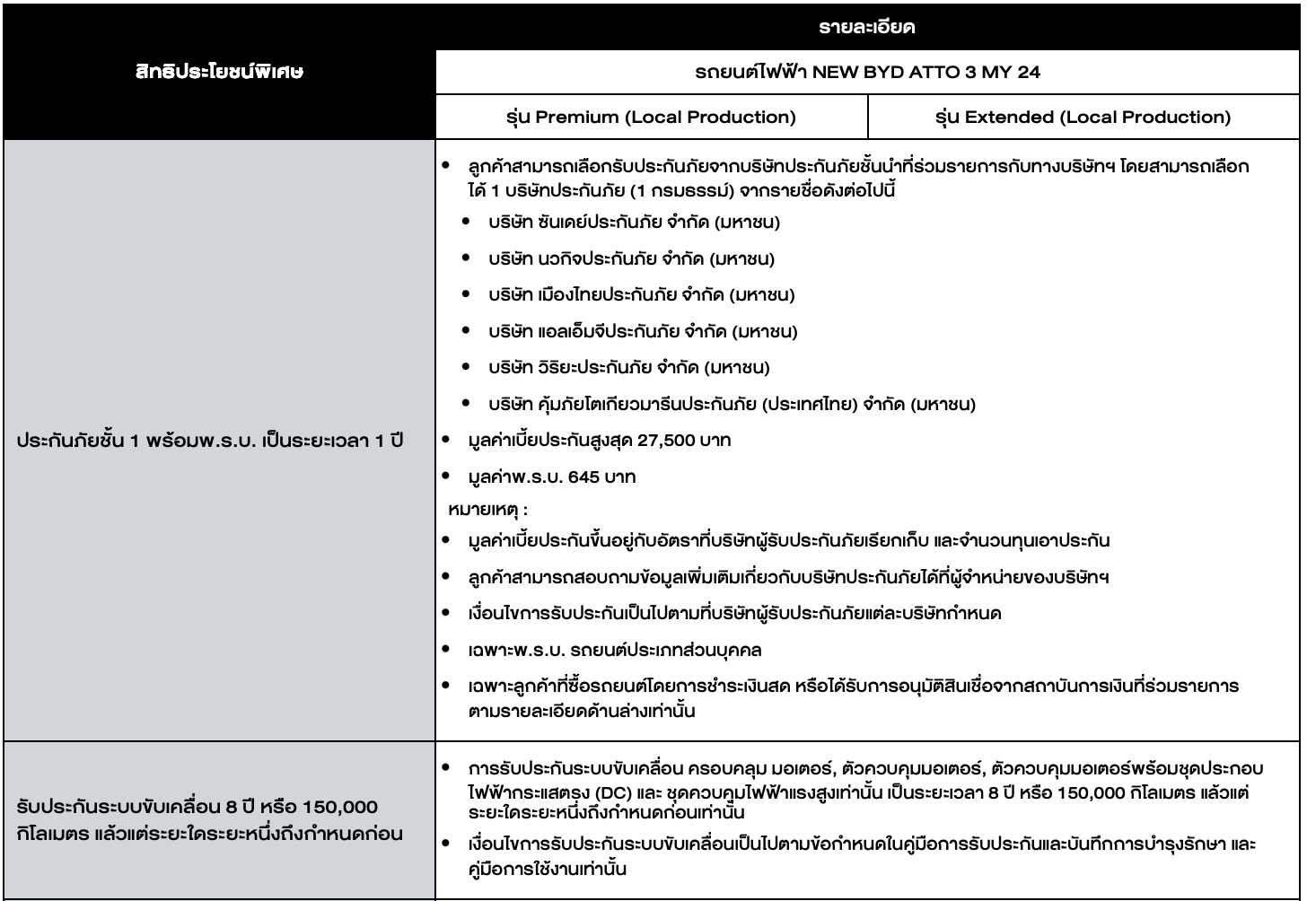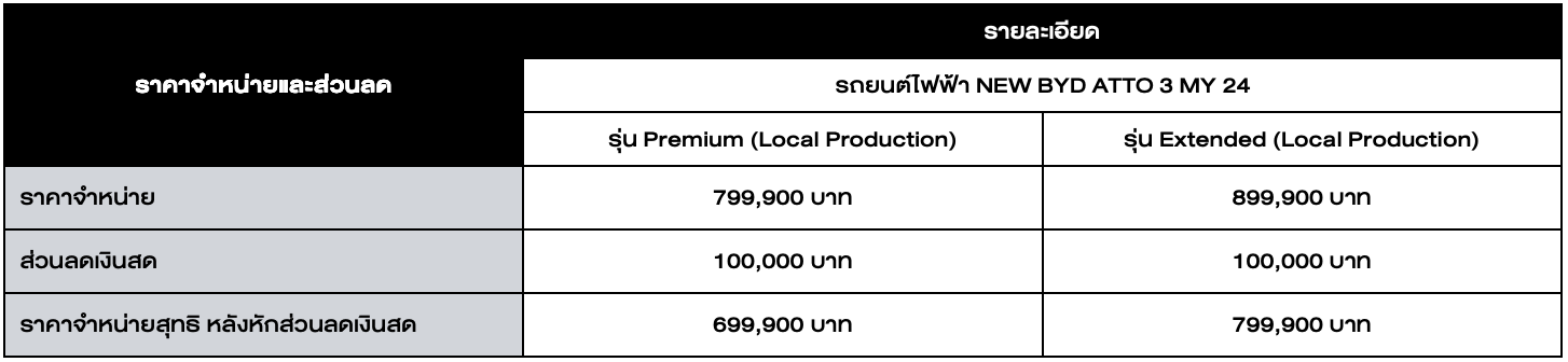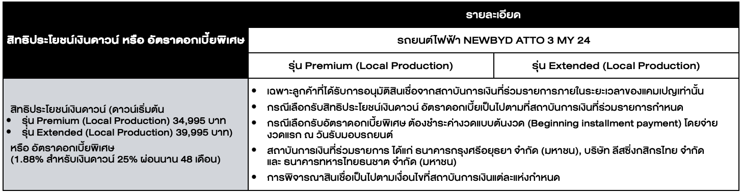 - หลักเกณฑ์การเข้าร่วมแคมเปญสำหรับลูกค้าที่จองซื้อรถยนต์ไฟฟ้า NEW BYD ATTO 3 MY 24 และได้รับใบกำกับภาษีสำหรับการซื้อรถยนต์ไฟฟ้า NEW BYD ATTO 3 MY 24 ซึ่งออกให้ภายในระยะเวลาของแคมเปญเท่านั้น