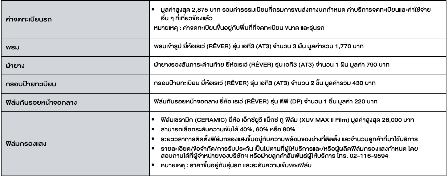 - ในการเข้าร่วมแคมเปญนี้ ลูกค้ารับทราบและยินยอมให้บริษัทฯ เก็บ รวบรวม ใช้ หรือเปิดเผย ชื่อ นามสกุล ภาพถ่าย ภาพเคลื่อนไหว เสียง และ/หรือข้อมูลอื่น ๆ ของลูกค้า ไม่ว่าจะสามารถระบุตัวลูกค้าได้โดยตรงหรือโดยอ้อมก็ตาม (“ข้อมูลส่วนบุคคล”) โดยลูกค้าสามารถศึกษานโยบายความเป็นส่วนตัวได้ที่ Website ของบริษัทฯ https://www.reverautomotive.com/privacy-policy