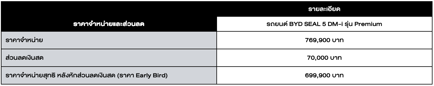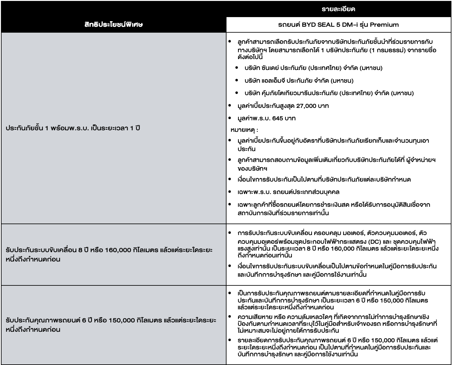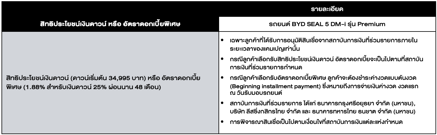 - หลักเกณฑ์การเข้าร่วมแคมเปญสำหรับลูกค้าที่จองซื้อรถยนต์ BYD SEAL 5 DM-i รุ่น Premium และได้รับใบกำกับภาษีสำหรับการซื้อรถยนต์ BYD SEAL 5 DM-i รุ่น Premium ซึ่งออกให้ภายในระยะเวลาของแคมเปญเท่านั้น
