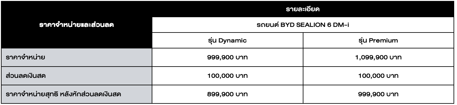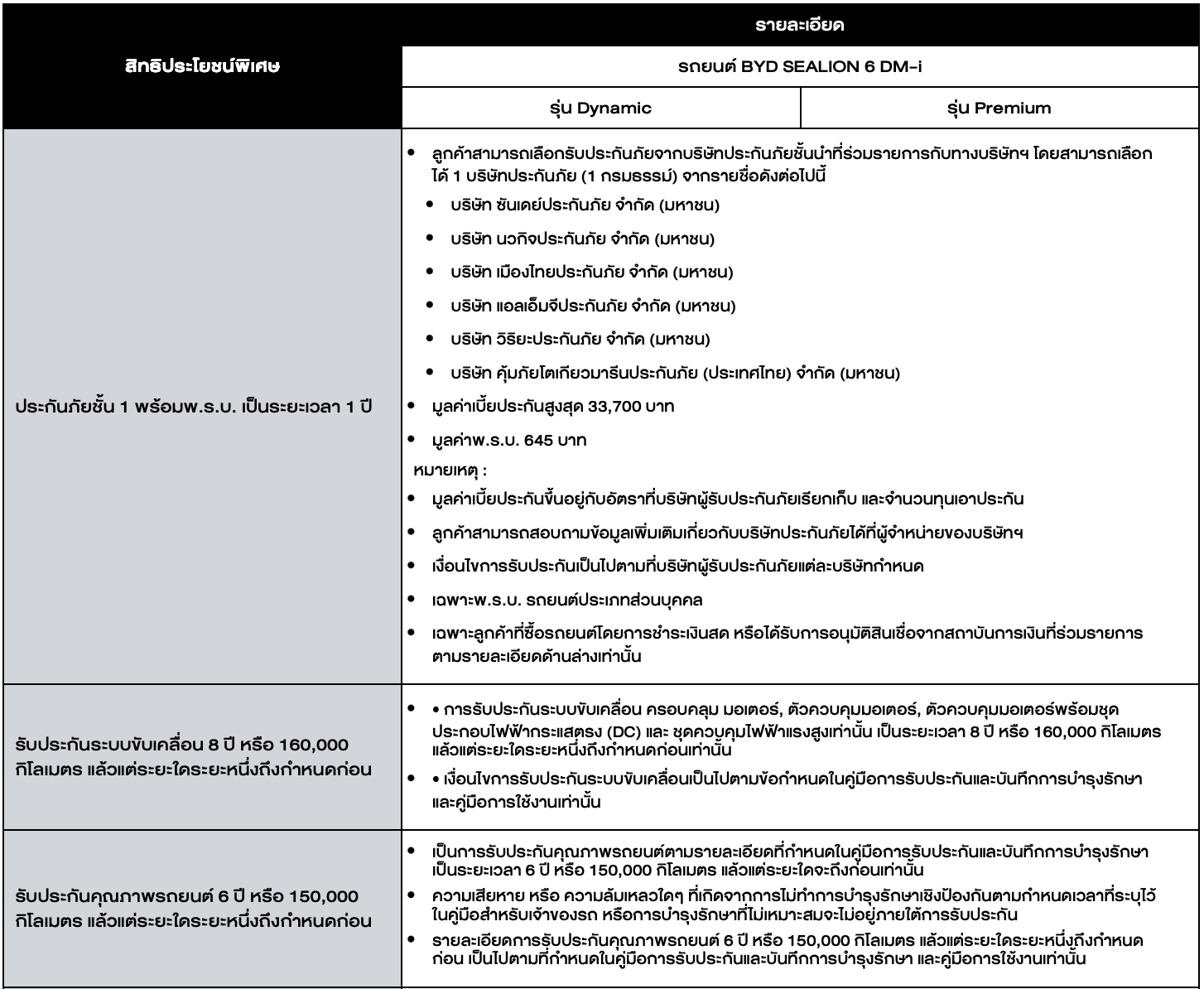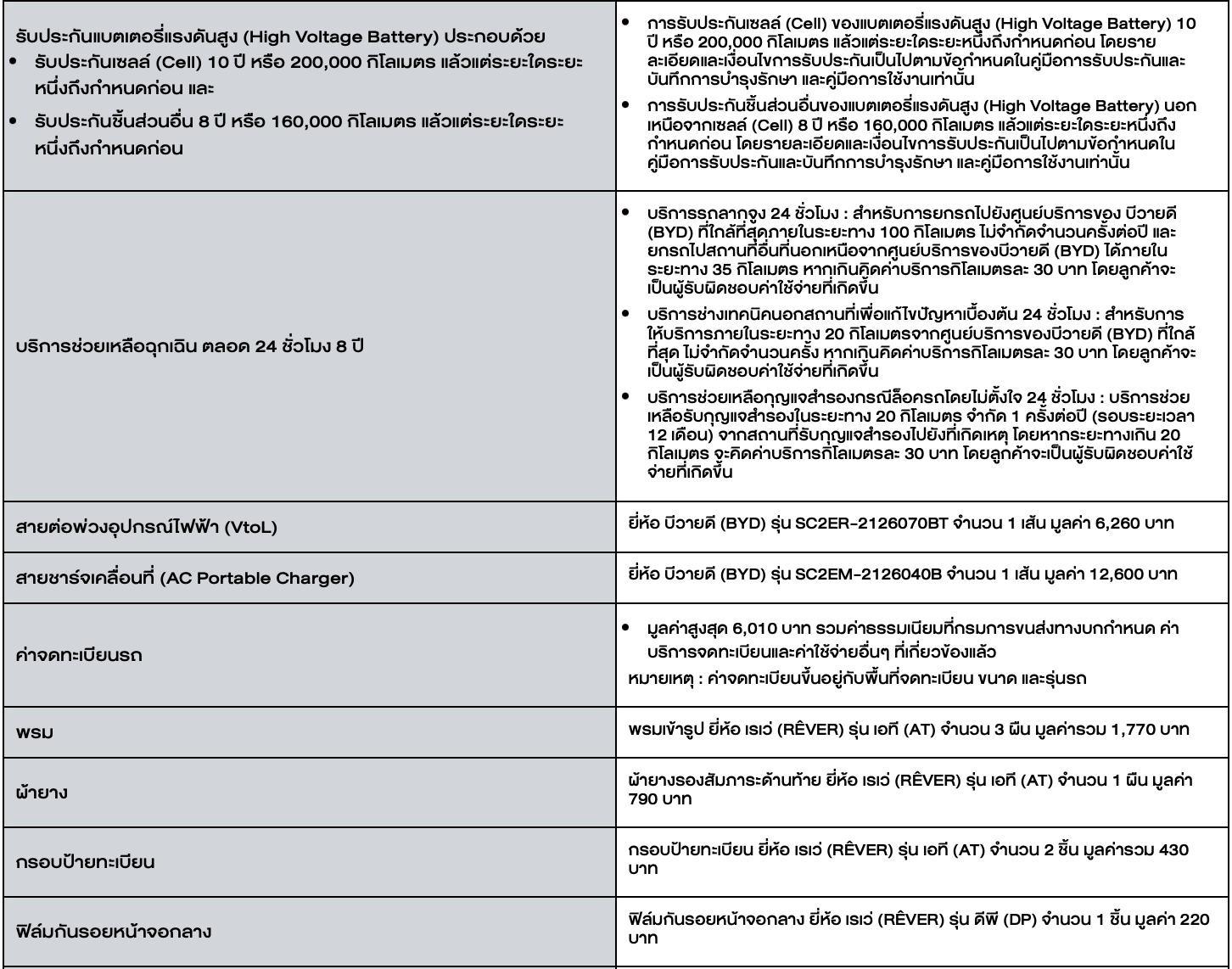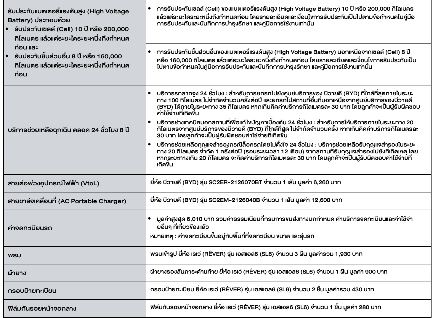 - หลักเกณฑ์การเข้าร่วมแคมเปญสำหรับลูกค้าที่จองซื้อรถยนต์ BYD SEALION 6 DM-i และได้รับใบกำกับภาษีสำหรับการซื้อรถยนต์ BYD SEALION 6 DM-i ซึ่งออกให้ภายในระยะเวลาของแคมเปญ เท่านั้น