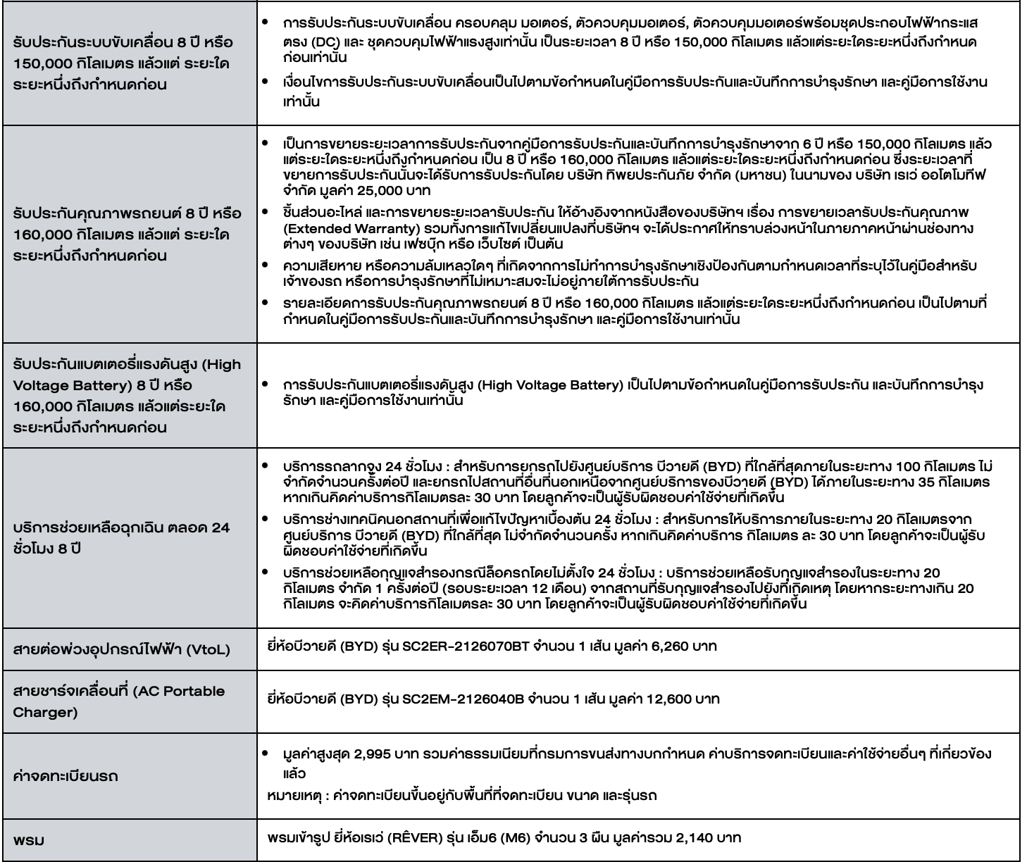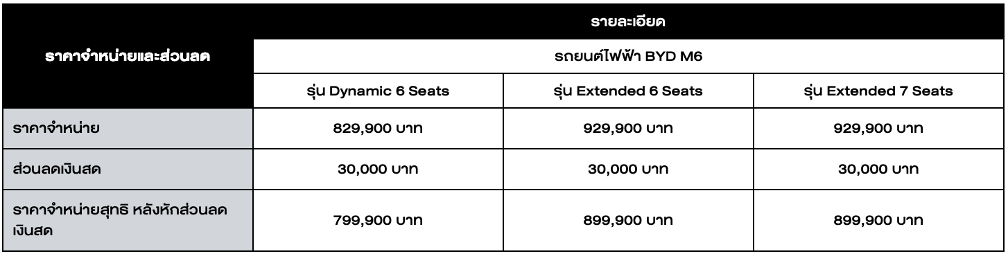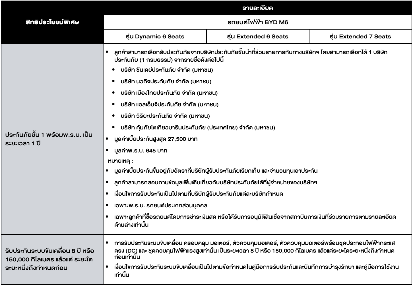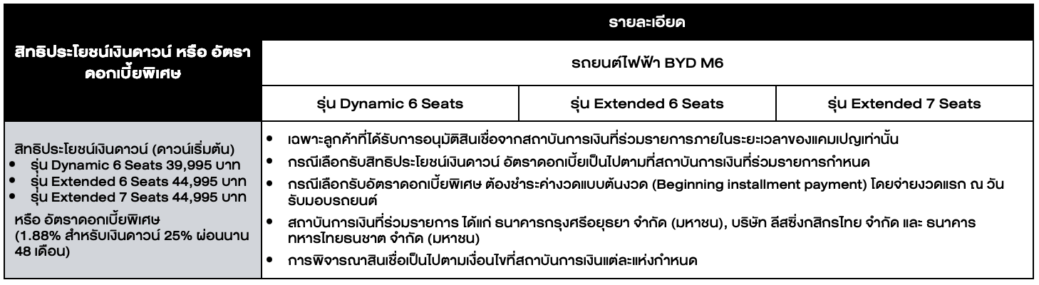 - หลักเกณฑ์การเข้าร่วมแคมเปญสำหรับลูกค้าที่จองซื้อรถยนต์ไฟฟ้า BYD M6 และได้รับใบกำกับภาษีสำหรับการซื้อรถยนต์ไฟฟ้า BYD M6 ซึ่งออกให้ภายในระยะเวลาของแคมเปญ เท่านั้น