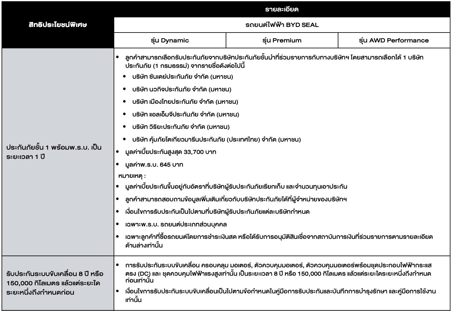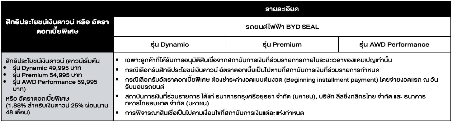 - หลักเกณฑ์การเข้าร่วมแคมเปญสำหรับลูกค้าที่จองซื้อรถยนต์ไฟฟ้า BYD SEAL และได้รับใบกำกับภาษีสำหรับการซื้อรถยนต์ไฟฟ้า BYD SEAL ซึ่งออกให้ภายในระยะเวลาของแคมเปญเท่านั้น