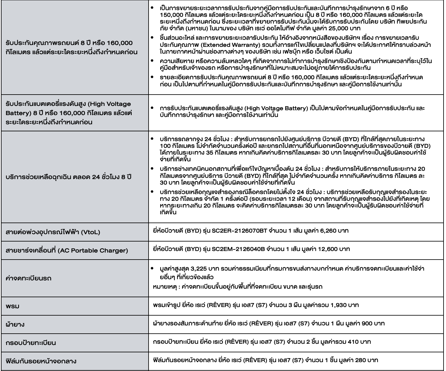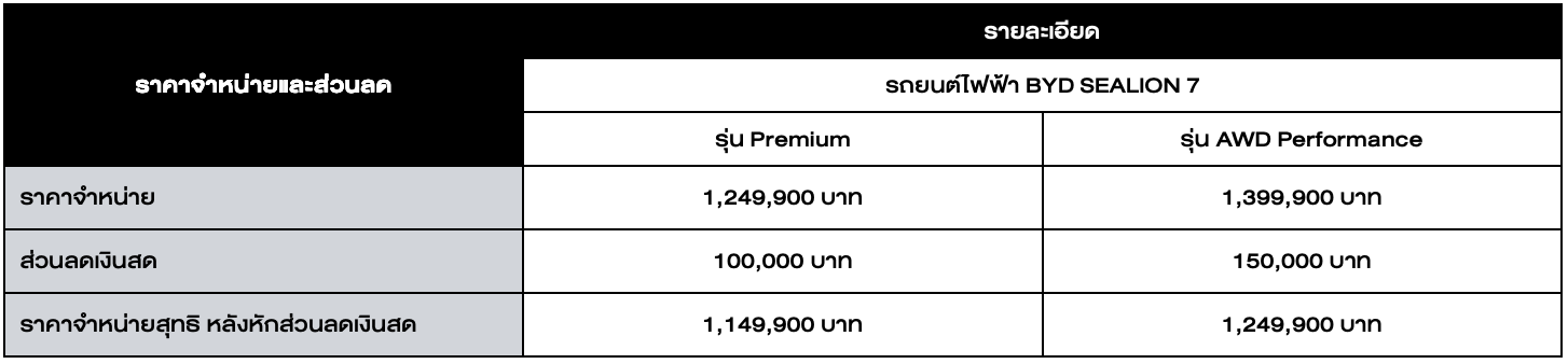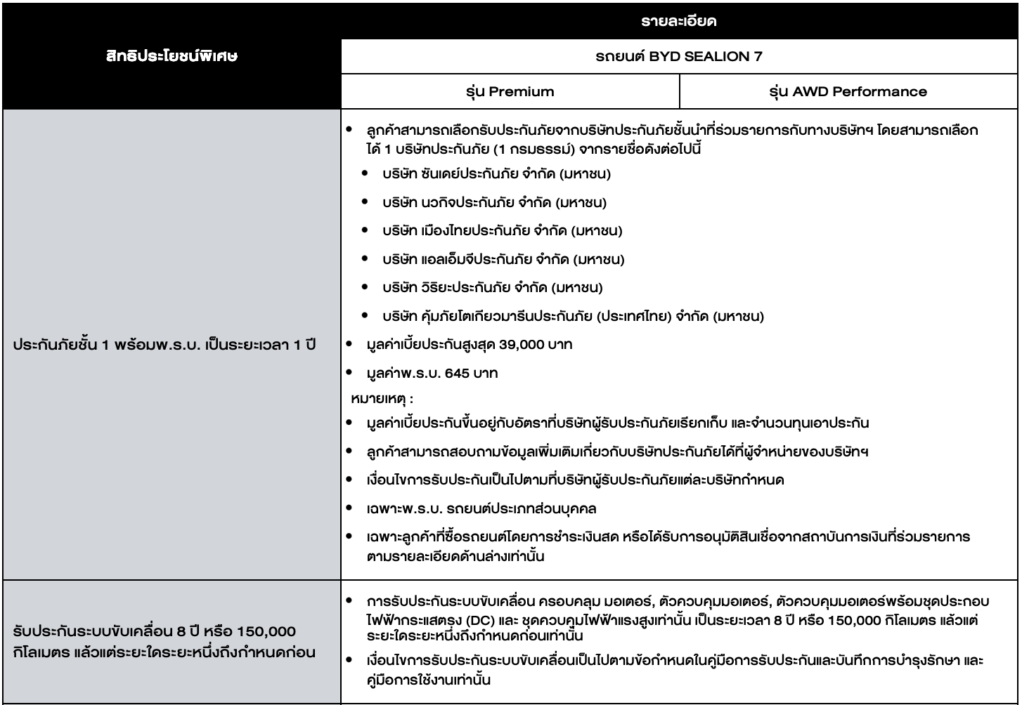 - หลักเกณฑ์การเข้าร่วมแคมเปญสำหรับลูกค้าที่จองซื้อรถยนต์ไฟฟ้า BYD SEALION 7 และได้รับใบกำกับภาษีสำหรับการซื้อรถยนต์ไฟฟ้า BYD SEALION 7 ซึ่งออกให้ภายในระยะเวลาของแคมเปญเท่านั้น